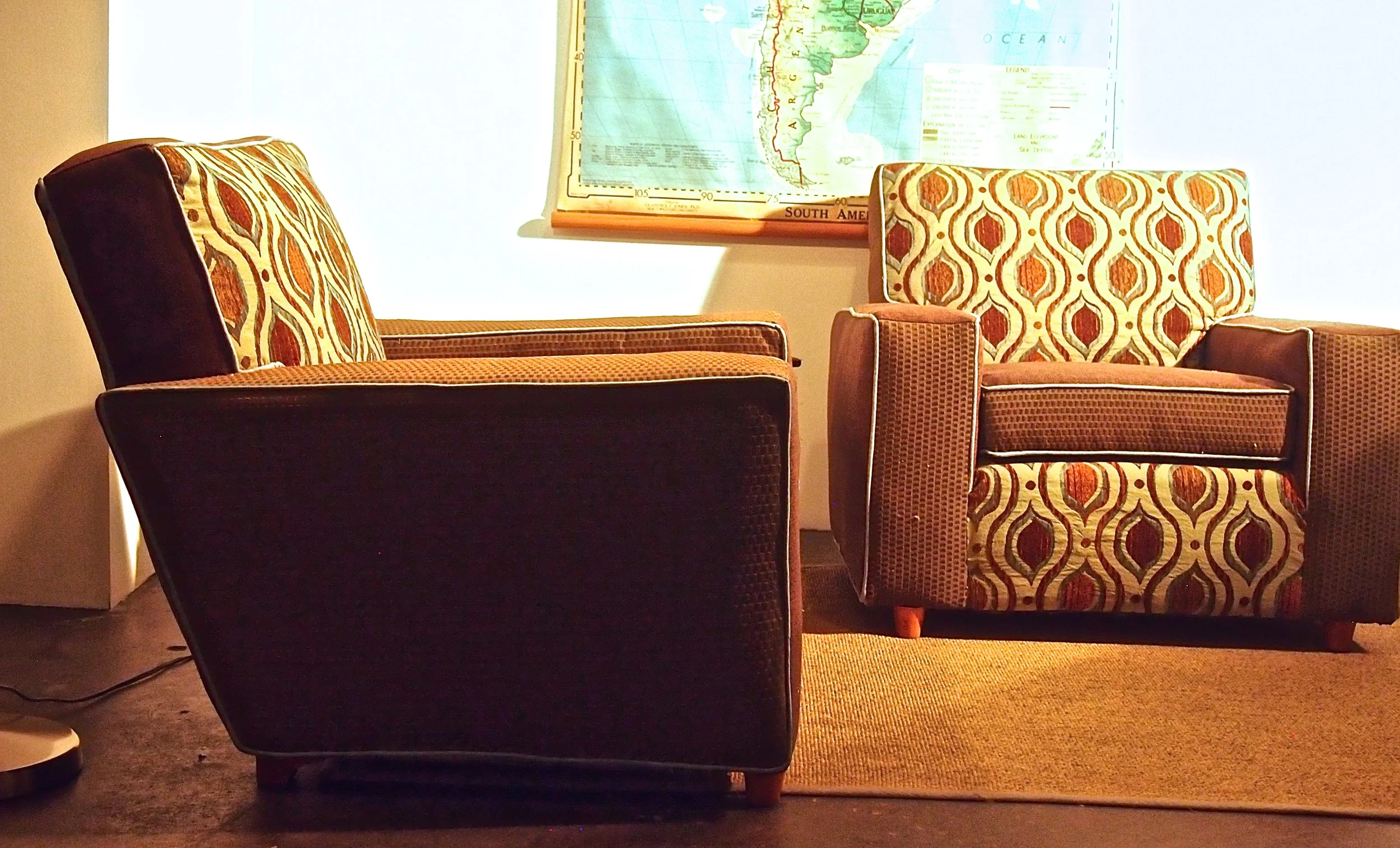 Maria bought these two oversized lounge chairs and a matching sofa on Long Island in the mid-fifties. Now they're new again and oh, so comfy. You can easily spend an afternoon reading, watching TV or just chatting. Strong lines with soft green and brown upholstery. Durable weaves so no worries about wear and tear.